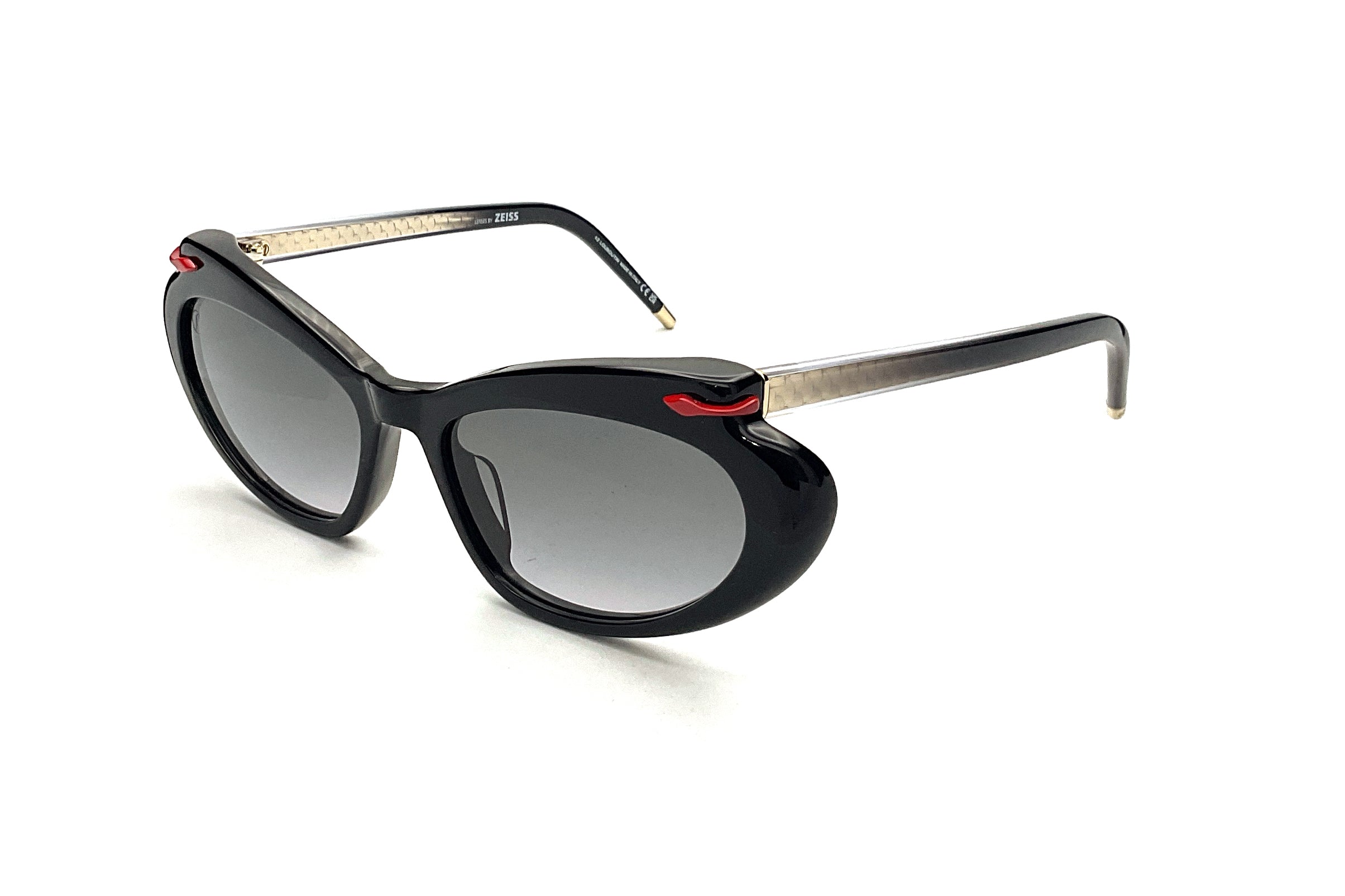 The Hot Chick LB0010 sunglasses feature a modern cat-eye design. The acetate frame exudes elegance, drawing inspiration from Christian Louboutin's Hot chick décolleté. The new sophisticated construction of the front is perfectly aligned with the refined detailing on the temples, where red and gold accents pay tribute to the brand's iconic style. This model is made in a black color with gradient smoke lenses. High-performance Zeiss lenses offering exceptional quality comfort and durability for Christian Louboutin collection.