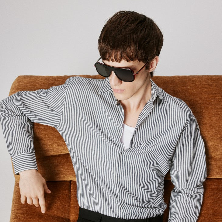 These navigator glasses are specially designed with clean, stylized lines that create an effortlessly chic look, its shiny acetate is reminiscent of the polished leather from traditional oxford shoes, as the Greggo ones, reflecting a bold yet classic statement.
