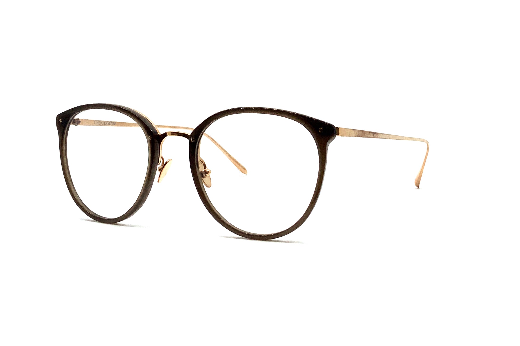Our iconic optical frame - the Calthorpe takes its name from the location of the brand's HQ on Calthorpe Street in London. Part of the core collection, the style employs a signature LINDA FARROW design language. Finely sculpted mocha brown acetate rims are paired with a delicate 18 carat rose gold plated titanium frame work which runs along the inner brown and into sleek tapered temples. Adjustable nose pads allow for a tailored fit.